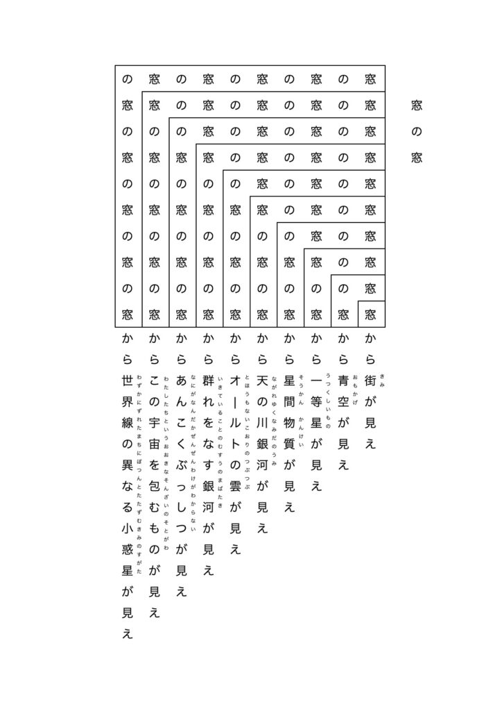 Takahiro Sawamura was born in Kyoto in1992 and has lived there all is life. His work has been featured in several collections and exhibitions, notably in volume 15 of Tokyo Poetry Journal, “Visual Visionary Poetry” (2024). His work is characterized by playful use of visual patterns linked to verbal meaning in both Japanese and English. His Japanese works show the influence of pioneers like Niikuni Sei’ichi (新国誠)and Kitazono Katue (北園克衛),adding a contemporary and internationalist flair to these 20th century classics. His publications include Kaiten Mokuba (The Merry-Go-Round; 2019, with Sumoguri Shun and Satō Mizuho, and Elastic Poems (2025).
